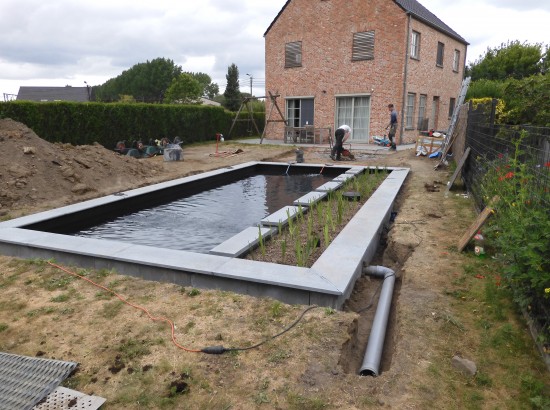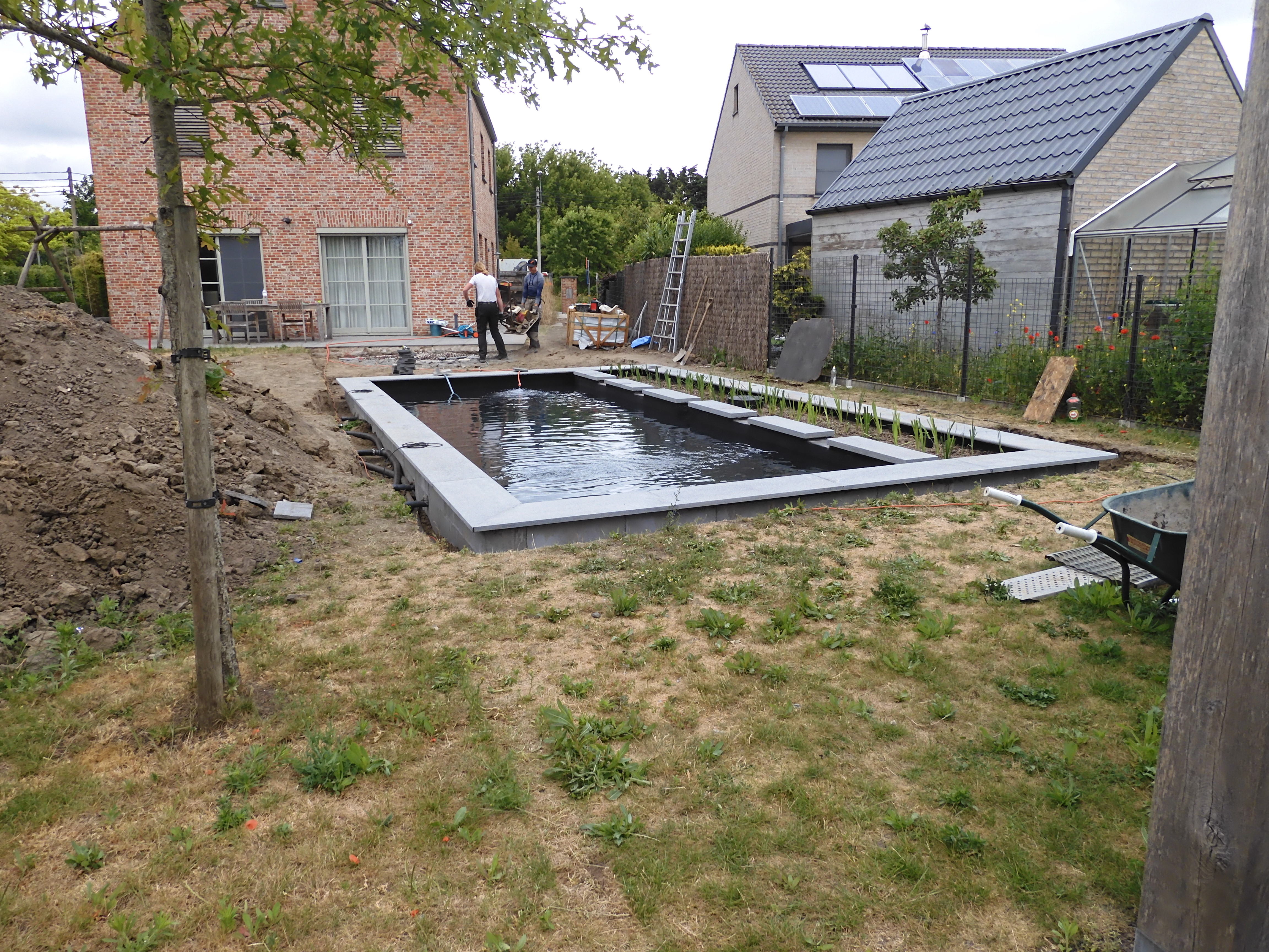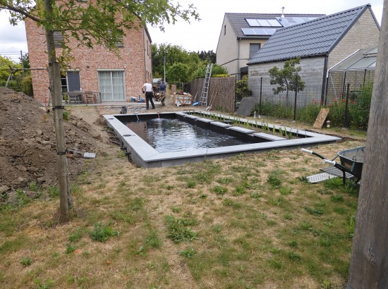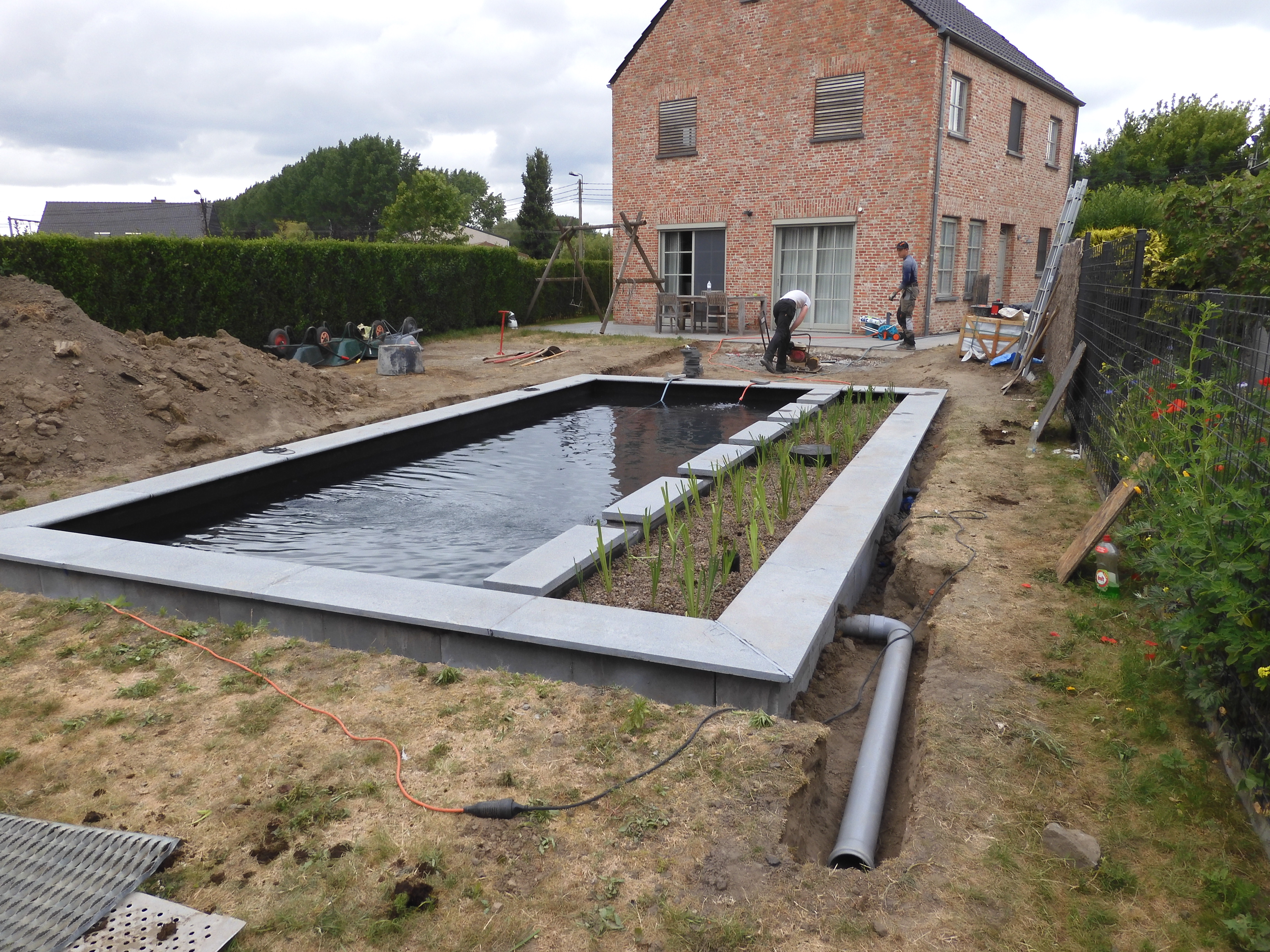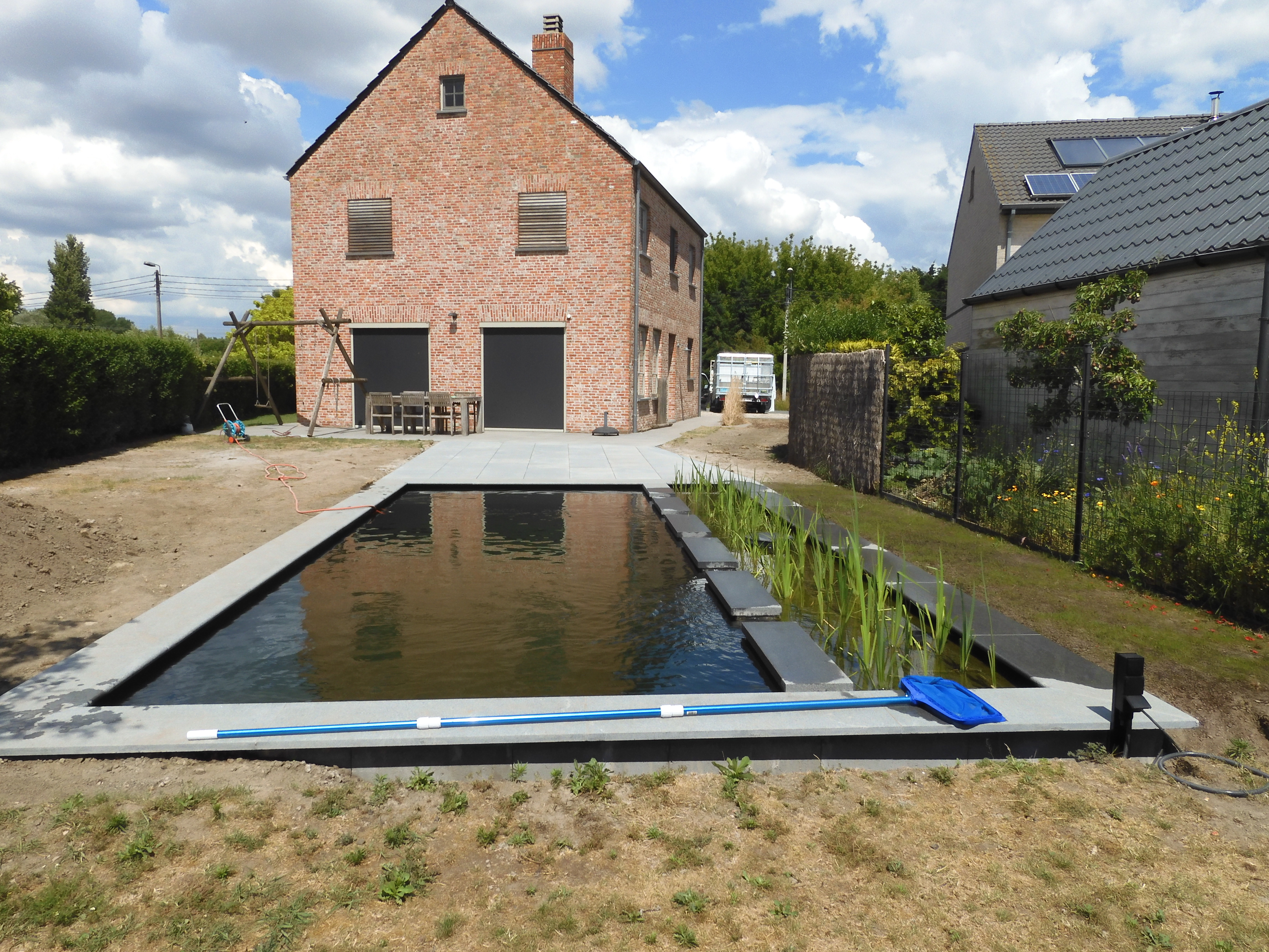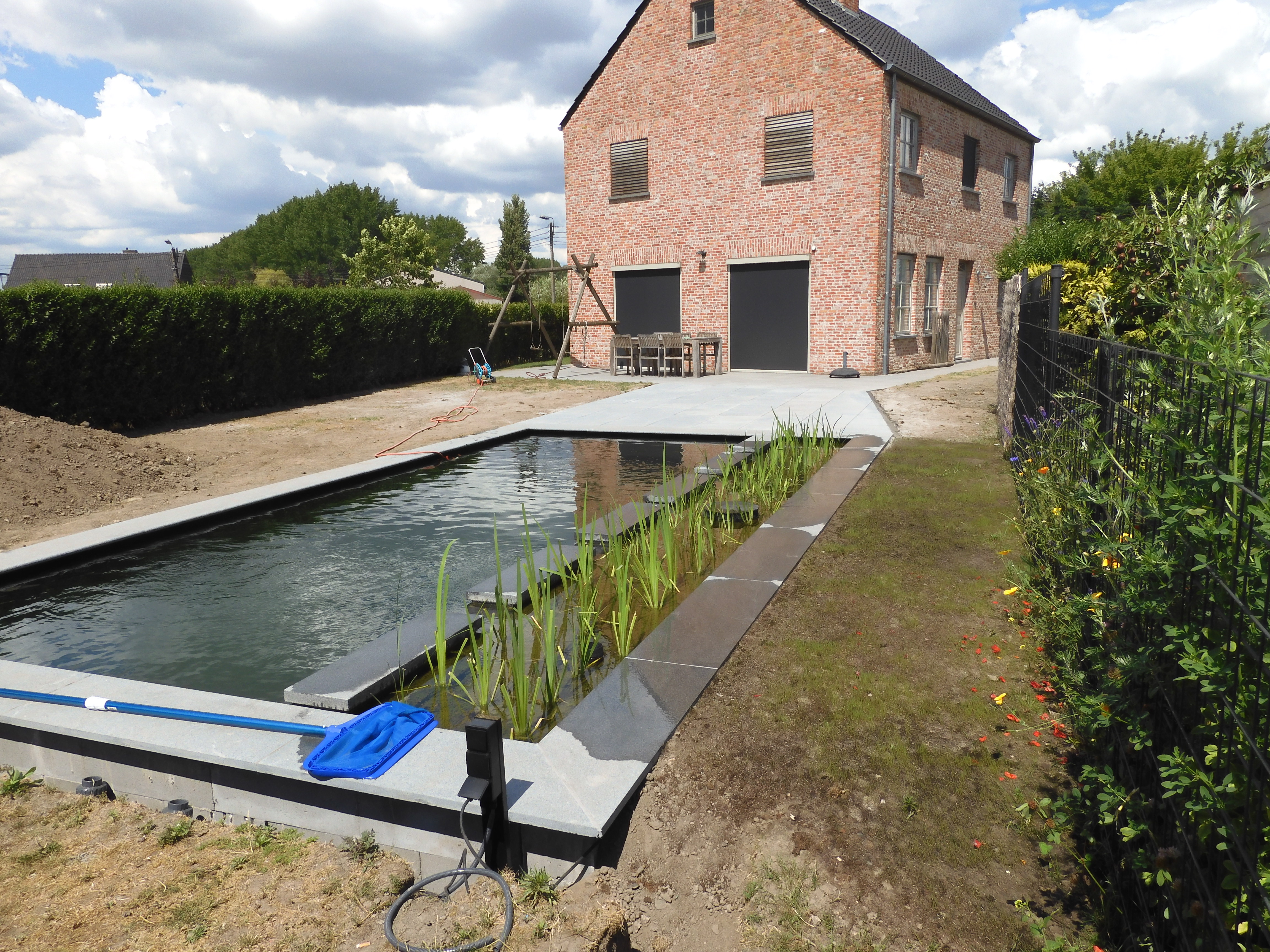 De betonnen wanden zijn recht opstaand om de bruikbare oppervlakte van de zwemvijver zo groot mogelijk te houden. Hier hebben we gekozen om de plantenfilter aan de lange zijde te voorzien. De zwarte kleur van de EPDM folie zorgt voor een vlugge opwarming en spiegelende reflectie van het wateroppervlak. De plantenfilter zorgt voor de waterzuivering van het water en is afgescheiden met stapstenen van het zwemgedeelte, gevuld met filtersubstraat (Lava) en beplant met irissen. Een pomp laat het water circuleren van de zwemzone naar de filterzone, doorheen het filtersubstraat en wwer terug naar de zwemzone. De randafwerking, stapstenen en aansluitende terras is in natuurseen (Graniet) .