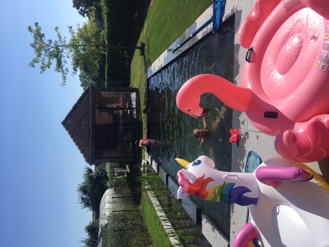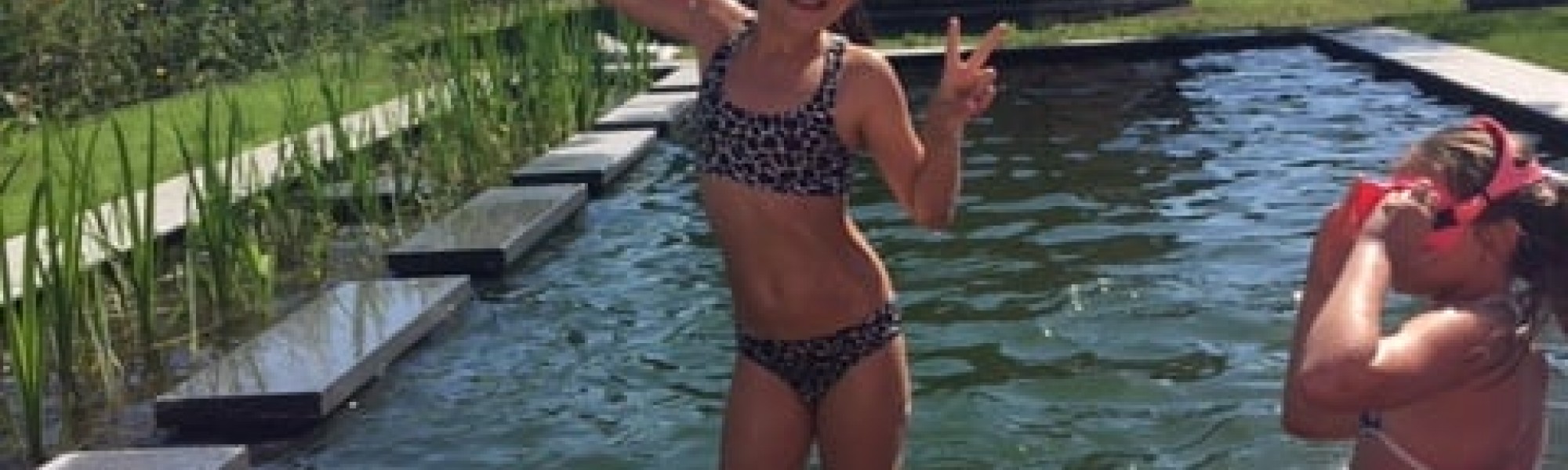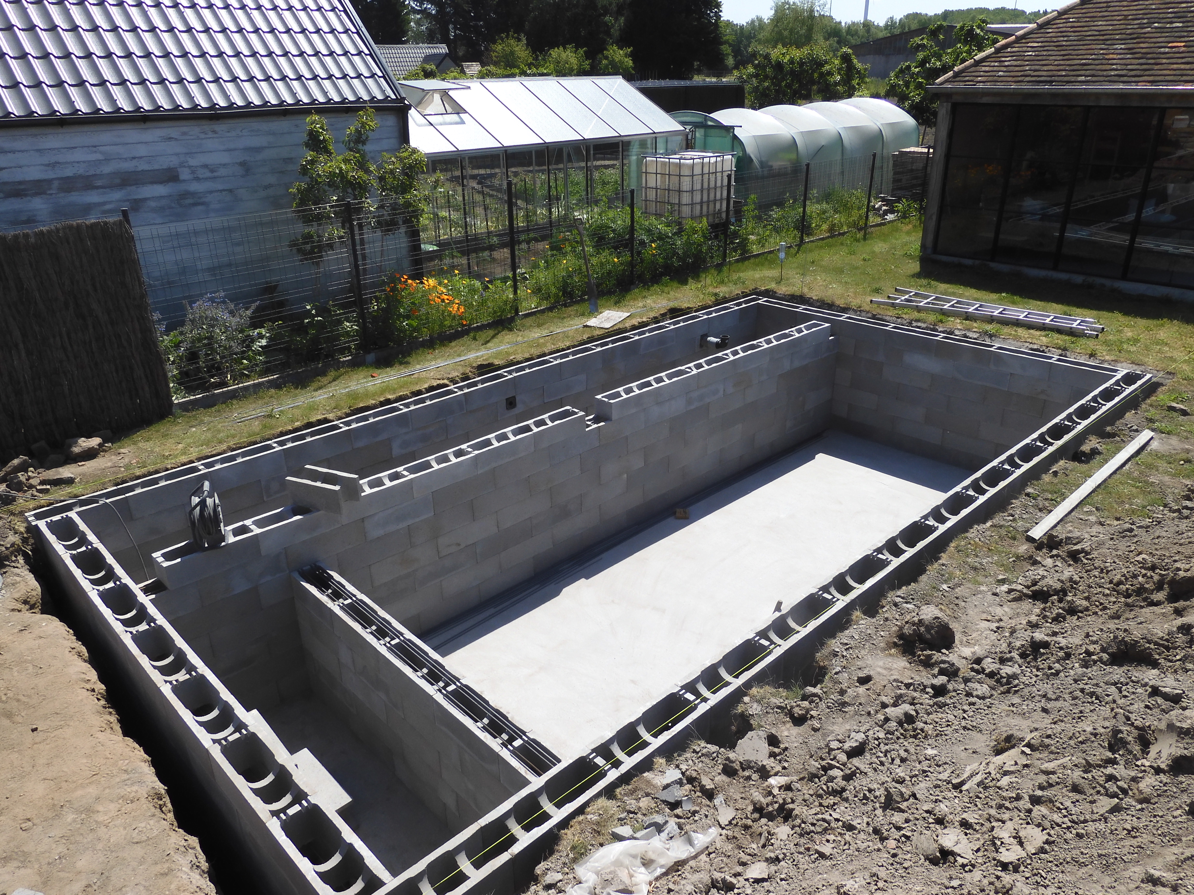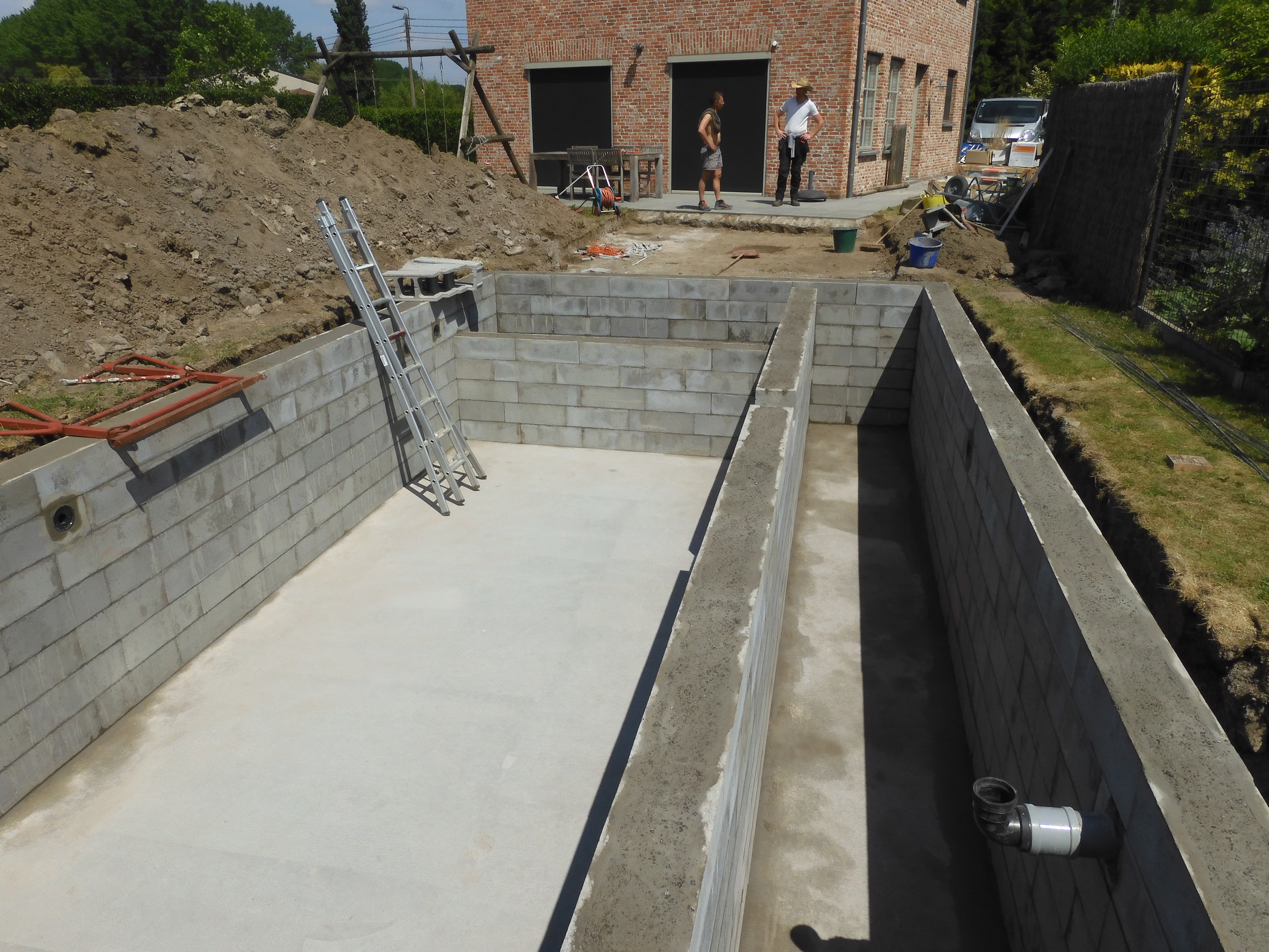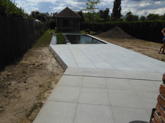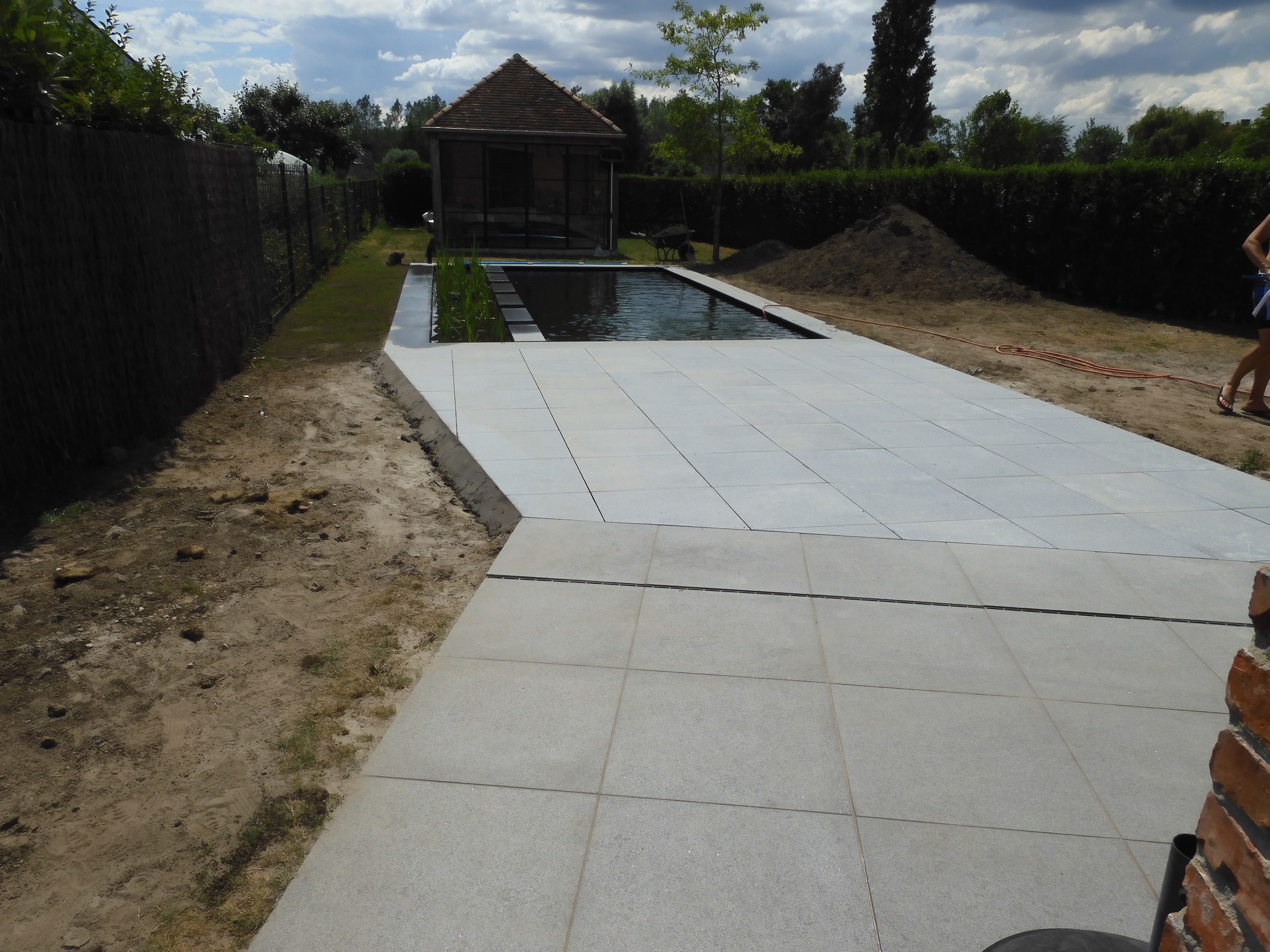 De betonnen wanden zijn recht opstaand om de bruikbare oppervlakte van de zwemvijver zo groot mogelijk te houden. Hier hebben we gekozen om de plantenfilter aan de lange zijde te voorzien. De zwarte kleur van de EPDM folie zorgt voor een vlugge opwarming en spiegelende reflectie van het wateroppervlak. De plantenfilter zorgt voor de waterzuivering van het water en is afgescheiden met stapstenen van het zwemgedeelte, gevuld met filtersubstraat (Lava) en beplant met irissen. Een pomp laat het water circuleren van de zwemzone naar de filterzone, doorheen het filtersubstraat en wwer terug naar de zwemzone. De randafwerking, stapstenen en aansluitende terras is in natuurseen (Graniet) .