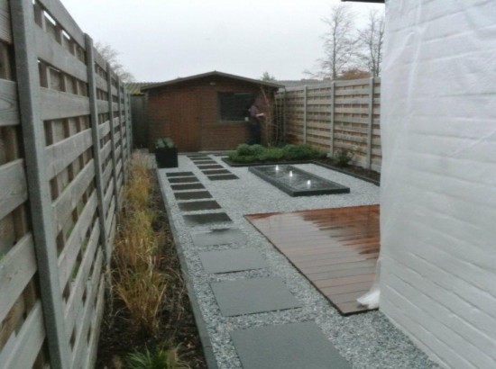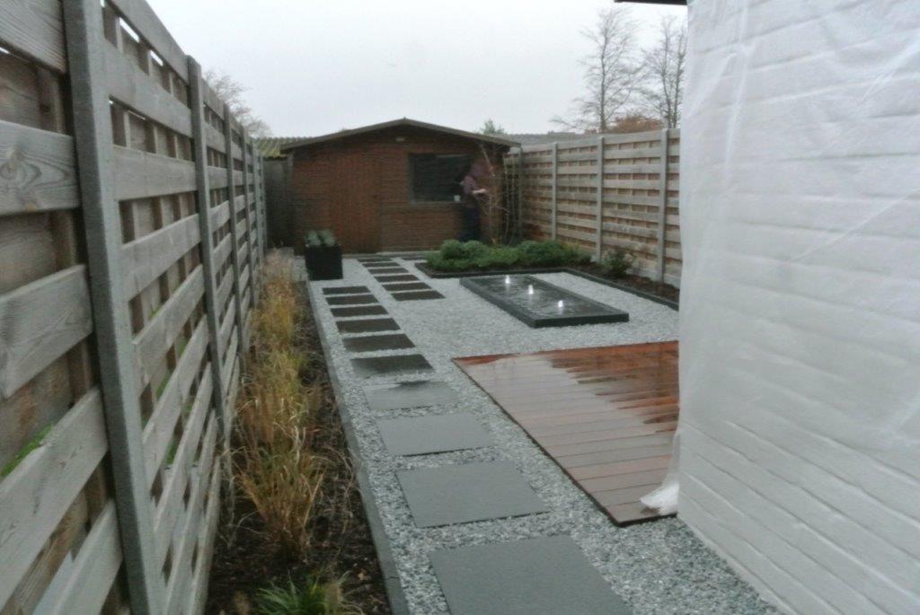 De staptegels geplaatst van de woning naar het achtergelgen tuinhuis bestaan uit Basalt. De tegel combineert prachtig met de hardhouten vlonder en het vlak van grijs split.
