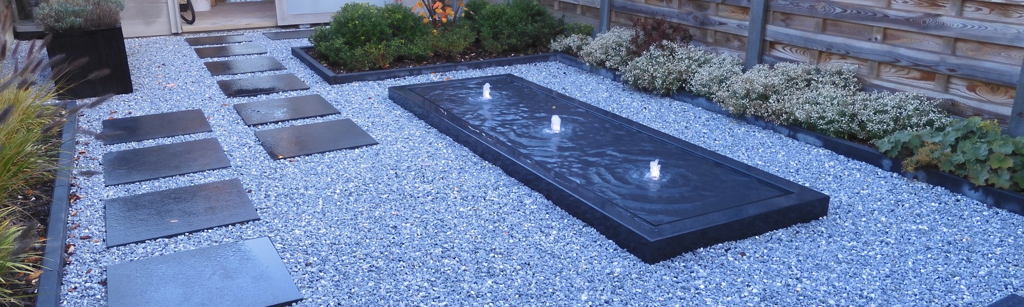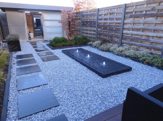 Het waterelement is de blikvanger in deze patio.