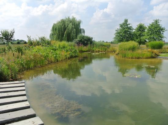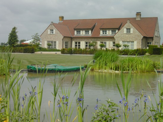 Achterkant kijkt uit op de weide met koeien en de natuurlijk aangelegde vijver .