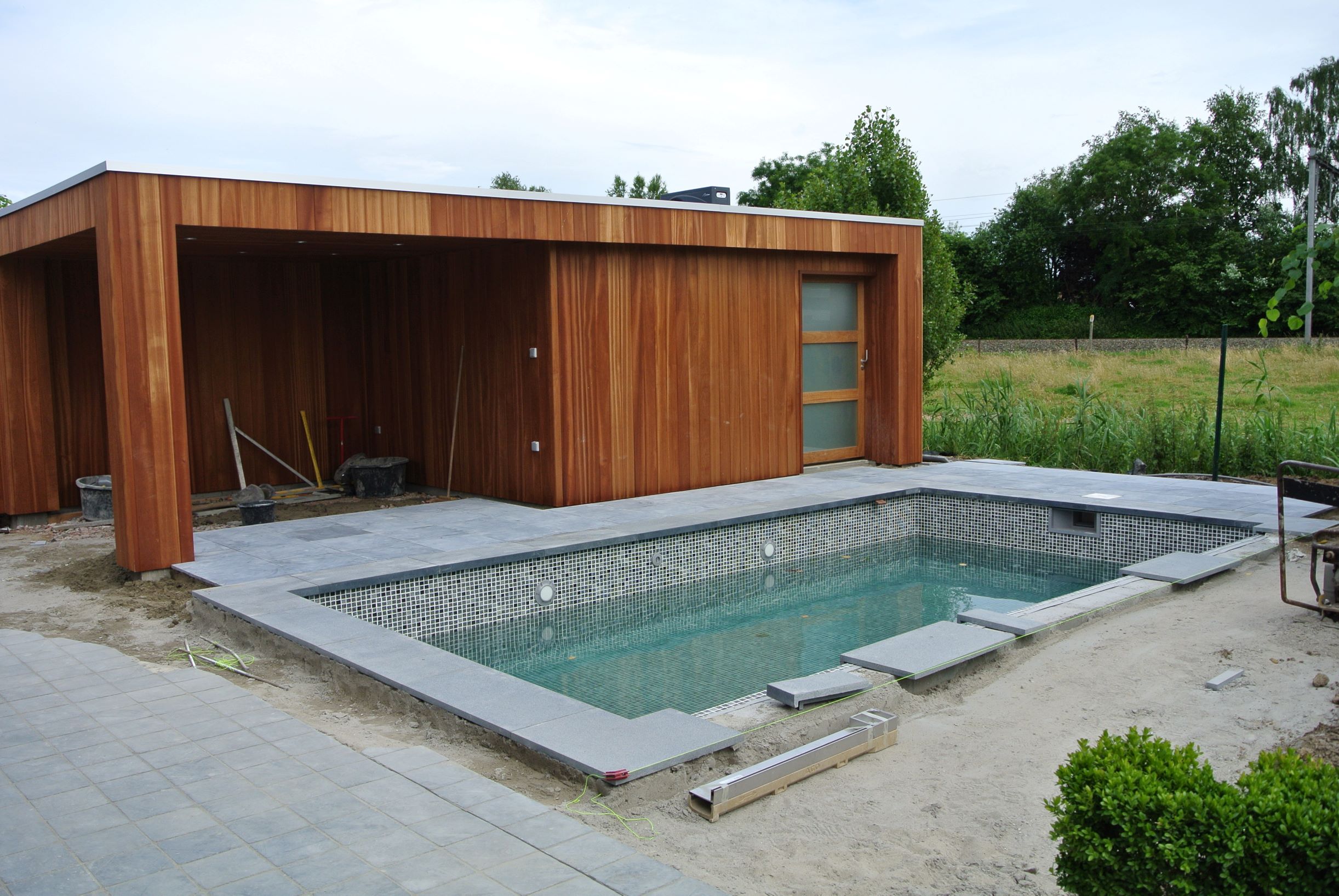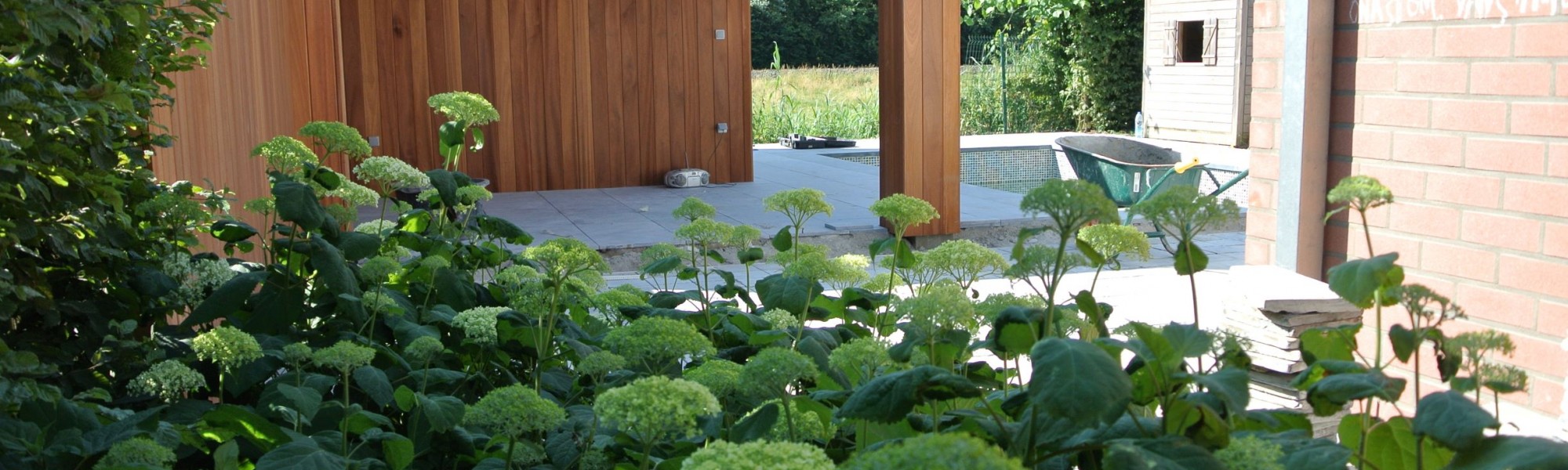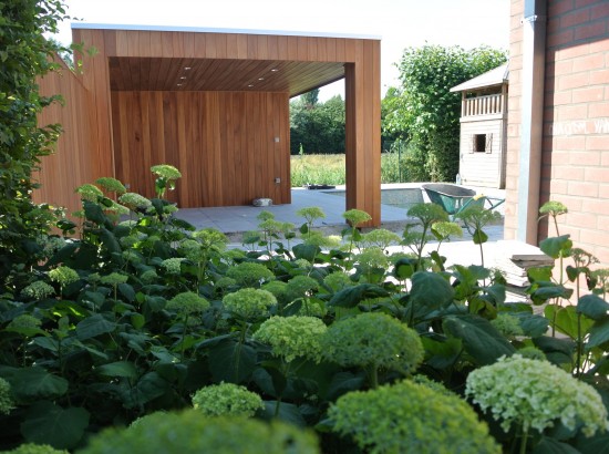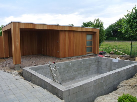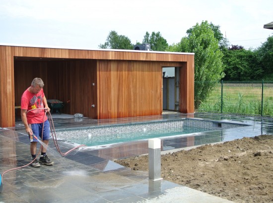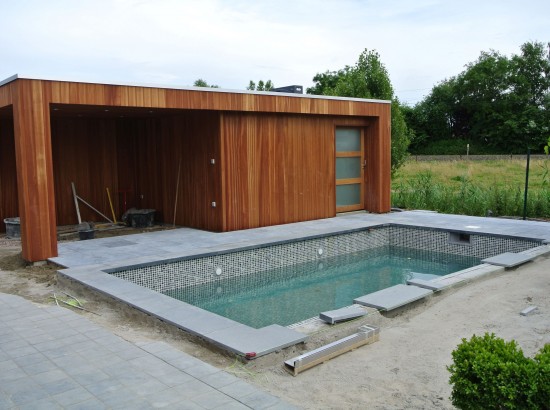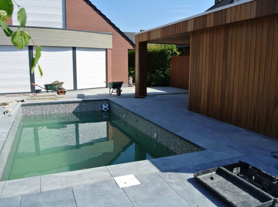 Een kleine strakke achtertuin met kwaliteitsvolle materialen. De grijze blauwsteen , de hardhouten poolhouse op maat gemaakt met zwembad zorgen voor de strakke belijning.