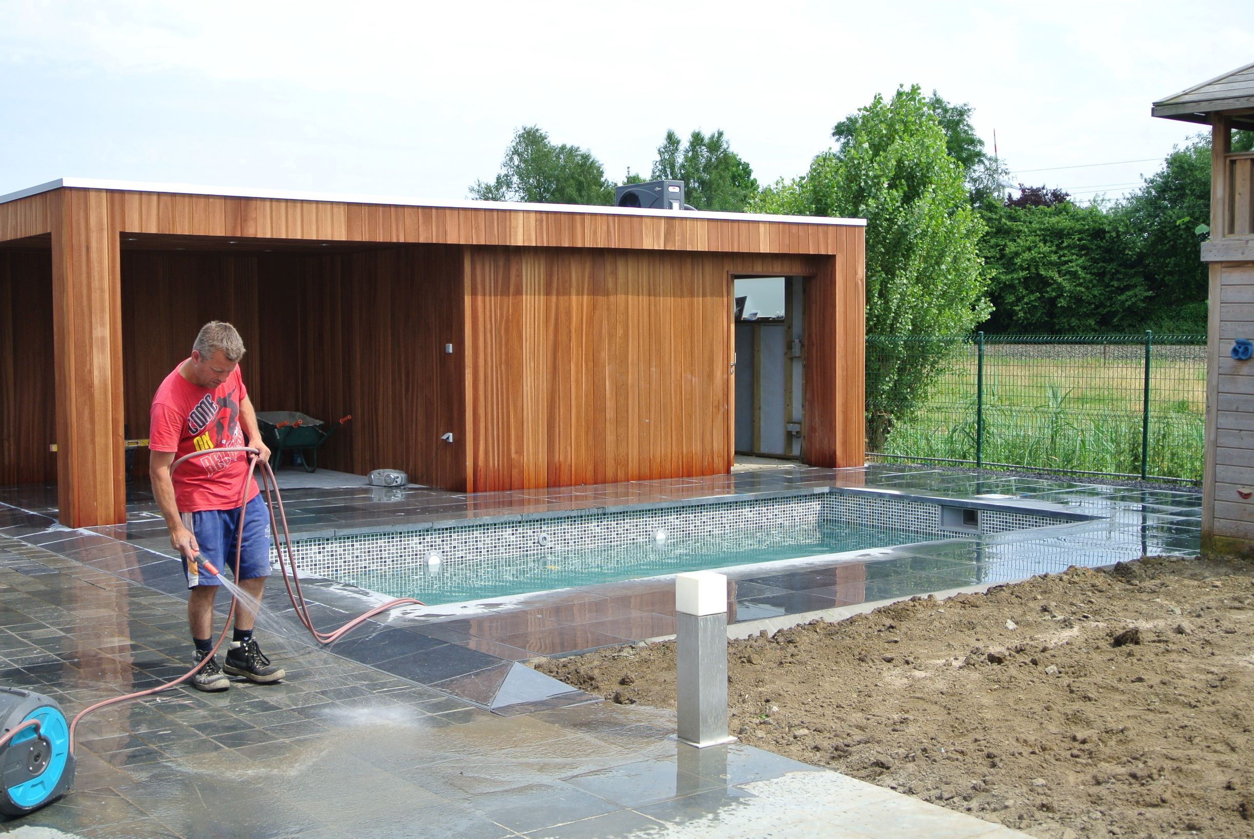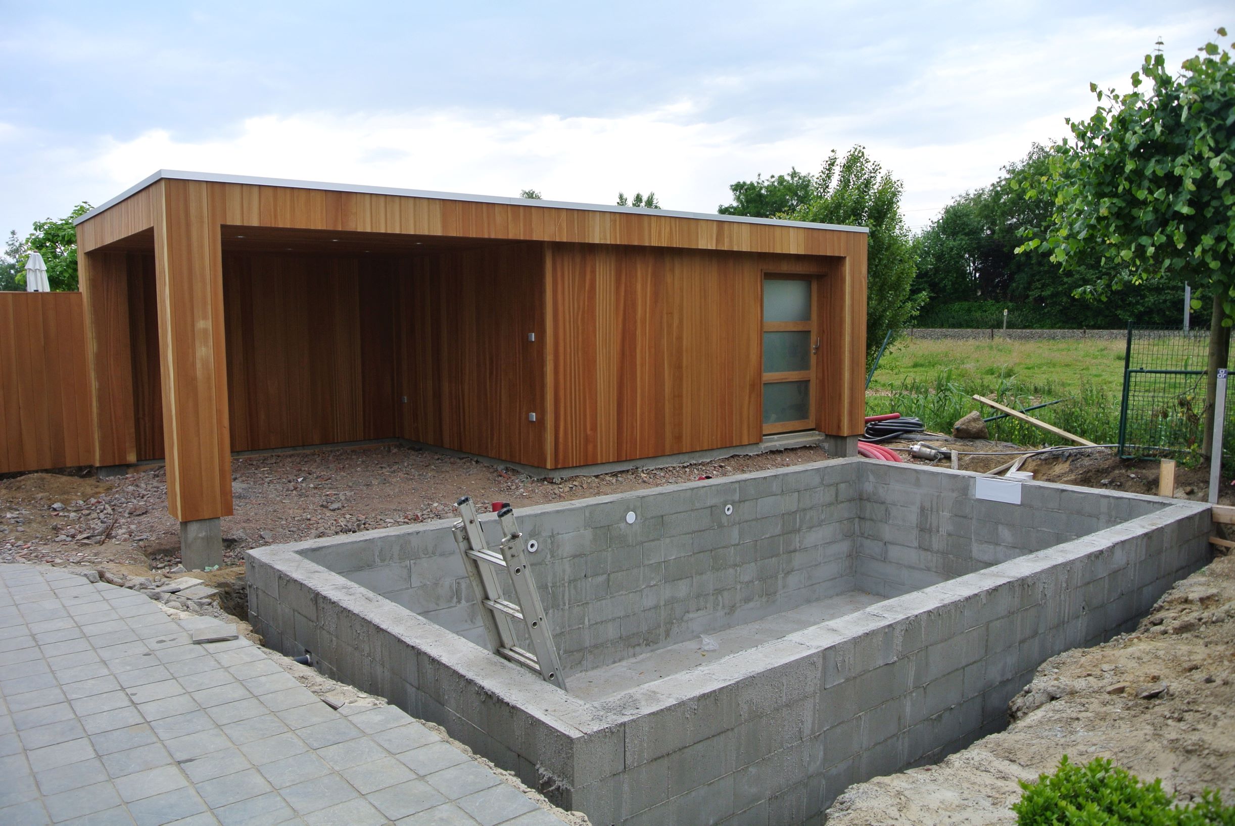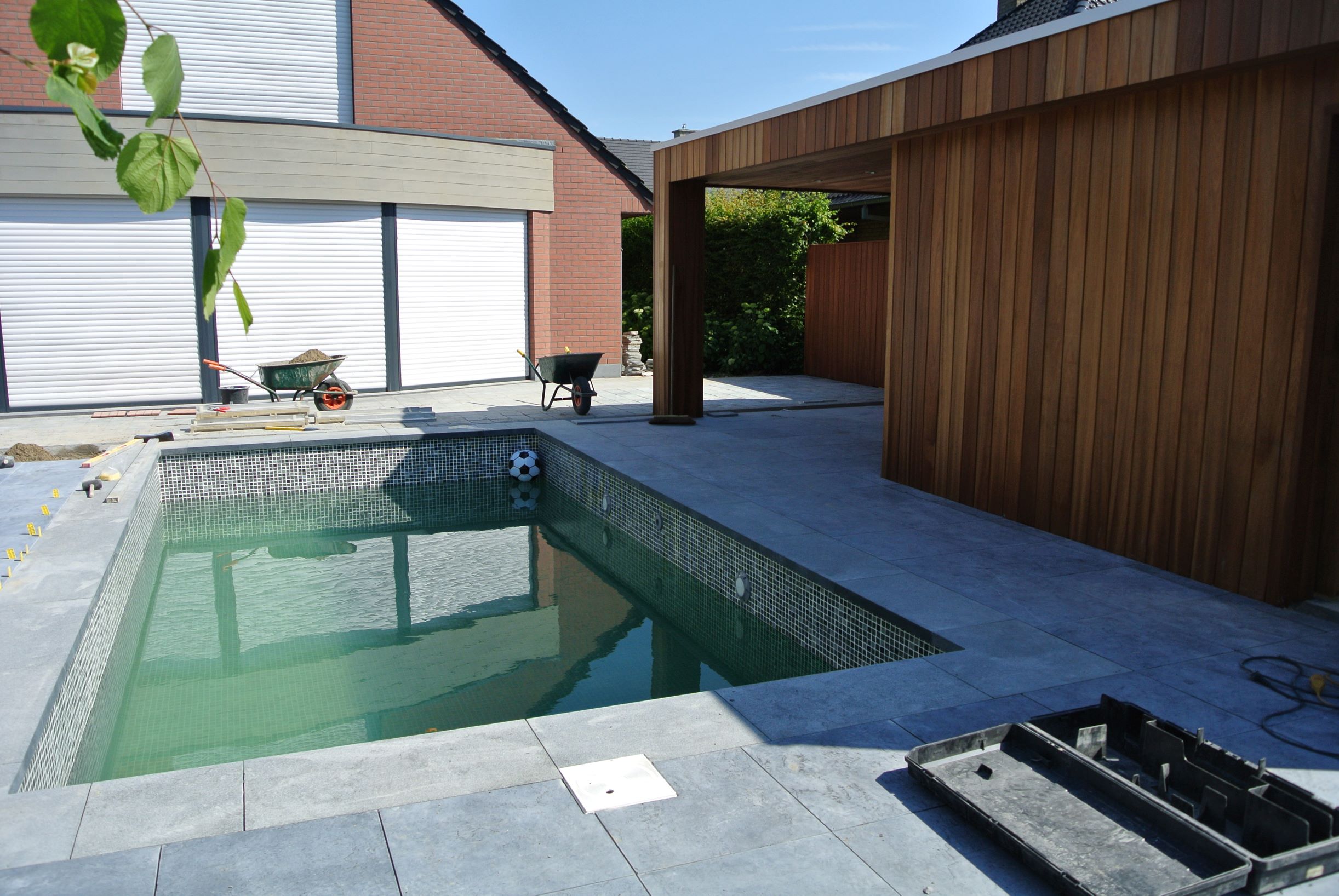 Een kleine strakke achtertuin met kwaliteitsvolle materialen. De grijze blauwsteen , de hardhouten poolhouse op maat gemaakt met zwembad zorgen voor de strakke belijning.