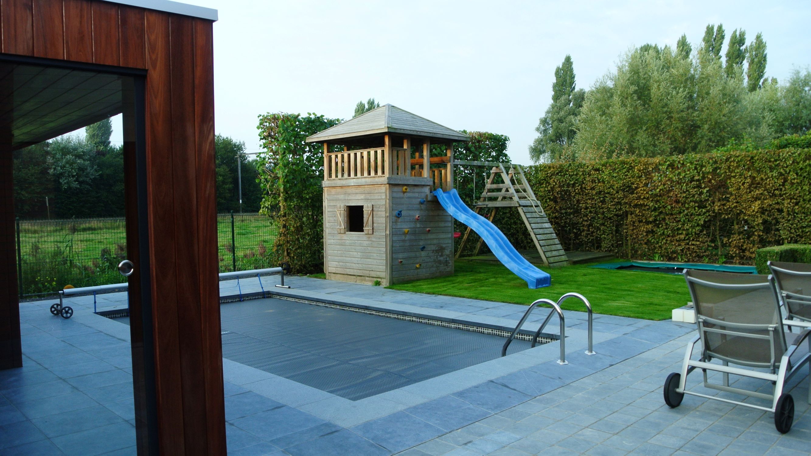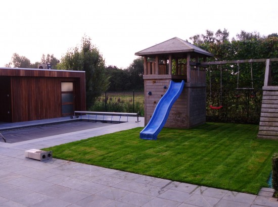 Er is gekozen voor een zeer onderhoudsvriendelijke tuin met weinig beplanting met eenĀ speelgazon, ingebouwde trampoline en klimtoren voor de kinderen.