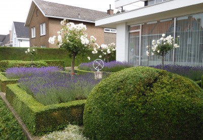 De golvende haag van portugese laurier en de bolronde snoeivorm van schijnhulst geven de voortuin een tijdloos karakter. De meerstammige krentenboom geeft een extra grandeur aan de voortuin, terwijl de siergrassen de woning romantisch omkaderen.