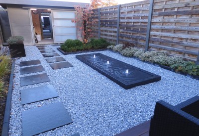 De kleine waterpartij tussen de terras en de tuin zorgt voor een speels effect en rustgevend geluid.