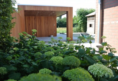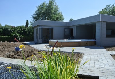 Belangrijk in deze tuin is uiteraard het welness-gedeelte. Ontspannen kan men in de heerlijke, halfverdiepte jacuzzi met zwemspa of sauna , welke is ingebouwd is in de moderne overkapping.