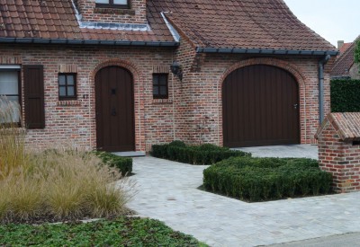 Landelijke voortuin met moderne toets. Het strak aangelegde pad naar de inkom en oprit zorgen echter voor een mooie open ruimte ,waardoor deze tuin een moderne tint krijgt.