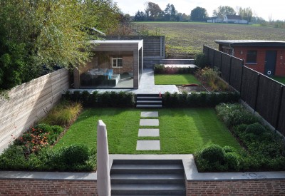 De randbeplanting en het gras maken van de tuin een gezellige plek om in te vertoeven.