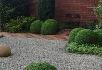 Onderhoudsvriendelijke voortuin met siergrassen in massief en de buxussen in wolkvorm gesnoeid.