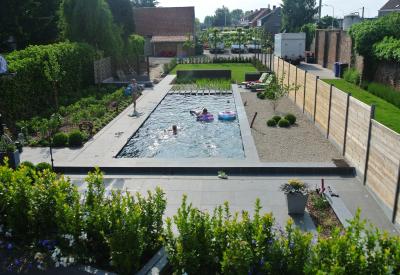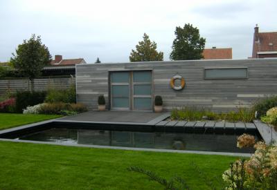 Tuin met zwemvijver en poolhouse te Menen