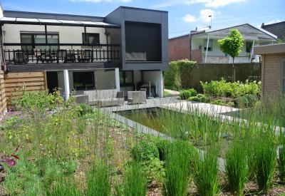 De strakke tuin met niveauverschil zorgt voor een mooi zicht vanuit de woonkamer op de zwemvijver.